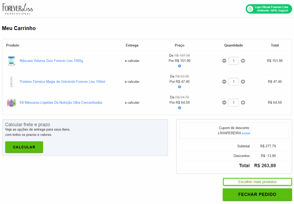 - Faça a sua compra normalmente no site da Forever Liss, adicione no carrinho seu produtos.