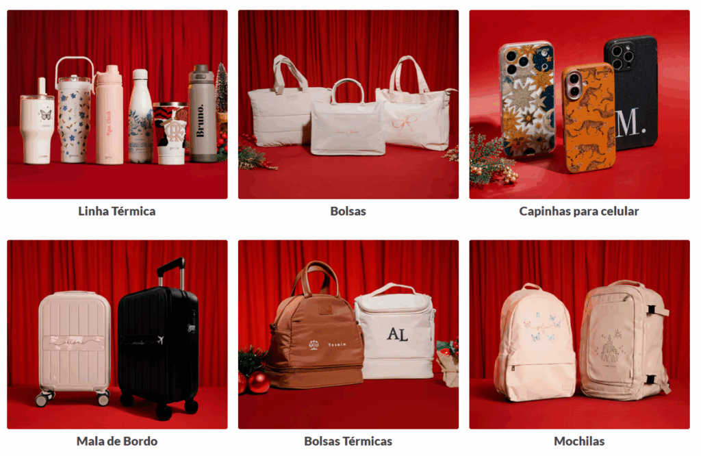 Capinhas para celular, cases de AirPods, fones, películas, mochilas, agendas, planners, garrafas e diversos itens de lifestyle — tudo com opções personalizáveis.
