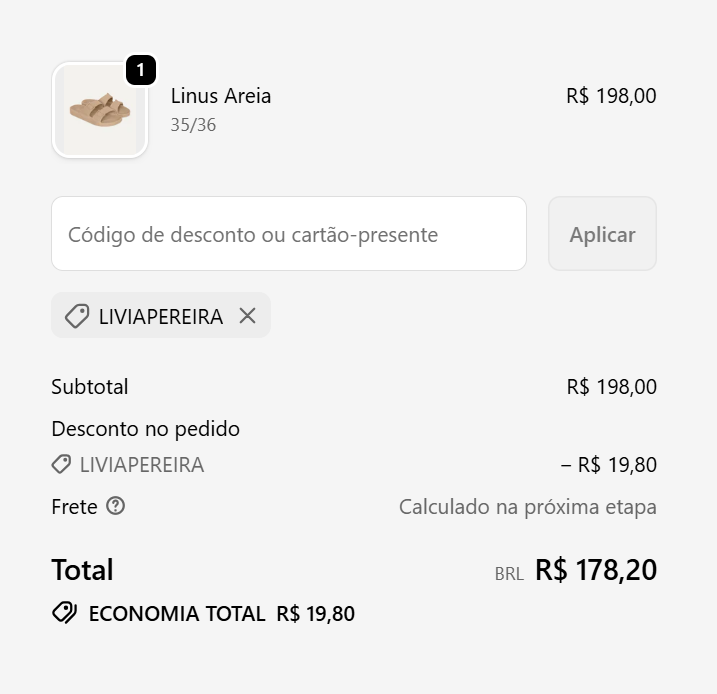 - Adicione o cupom de desconto LIVIAPEREIRA. Automaticamente o sistema aplicará o desconto. Você pode visualizar em desconto no pedido abaixo do subtotal. Lembrando que o desconto LIVIAPEREIRA é cumulativo com outras promoções.