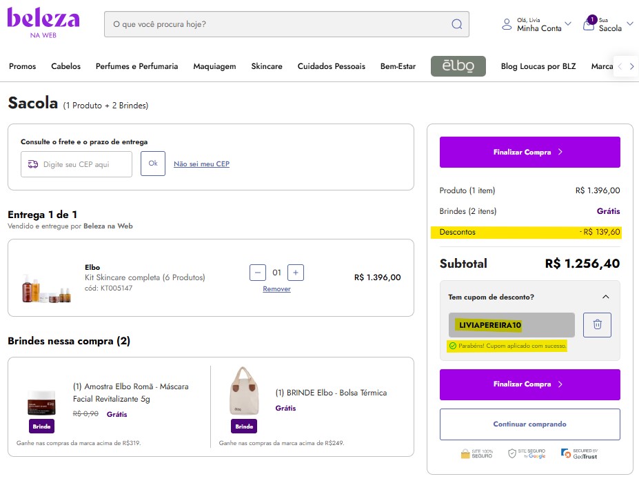 Se você quer garantir os produtos de Elbo, a dica é comprar na Beleza na Web — minha loja confiável, com entrega rápida e diversos benefícios. Usando o meu link de afiliada você garante qualquer produto com desconto, incluindo os produtos de cuidados para pele de Elbo.