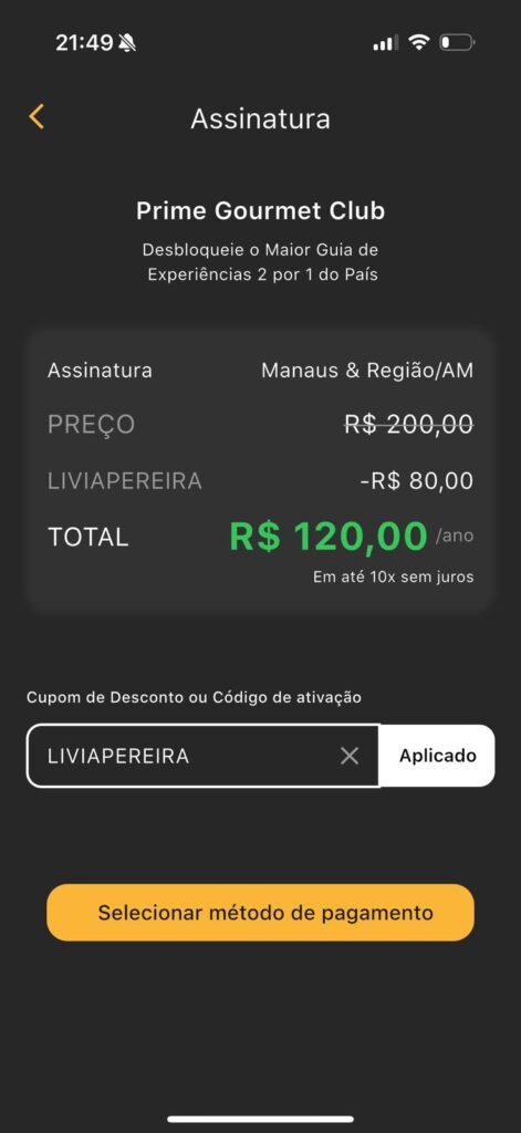 Após conhecer os parceiros, siga para a assinatura do clube de benefícios. Clique em ‘ative agora o seu Prime‘, em seguida, clique em “adicionar cupom de desconto”. Então, coloque o meu cupom LIVIAPEREIRA para garantir R$10 off. O valor será reduzido da assinatura anual, no caso do Prime Gourmet Manaus, a assinatura de R$200 sai por R$190. Os valores podem sofrer alterações.
